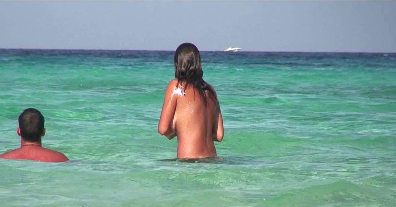 Sexy Nudist Babe Topless showing tits on nude beach 994